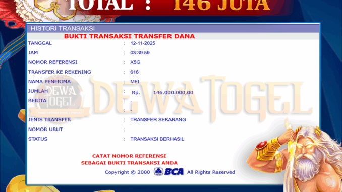 DEWATOGEL mengucapkan selamat kepada user id : SEI*** yang telah berhasil mendapatkan jackpot pada permainan SLOT DI GATES OF GATOT KACA. Kemenangan sebesar Rp 146.000.000,-. telah dibayarkan LUNAS oleh pihak dewatogel kepada pemilik user id setelah yang bersangkutan mengisi formulir withdraw. Proses pencairan dana berlangsung sangat cepat hanya dalam waktu 5-10 menit sudah berada dalam rekening pemilik user id. Bukti transfer yang dapat anda lihat adalah bukti SAH / VALID yang langsung di dapatkan melalui bukti transaksi dari Bank yang digunakan untuk pengiriman dana pada rekening pemilik user id. Terima kasih kami sampaikan kepada para pengguna setia DEWATOGEL yang telah menggunakan situs kami, sebagai Bandar Terpercaya yang pastinya membayar semua kemenangan member hingga lunas. Apakah DEWATOGEL PENIPU ? Reputasi “DEWATOGEL TERPERCAYA” sudah sangat melekat. puluhan hingga ratusan ribu pengguna setia DEWATOGEL tetap menggunakan situs terbesar dan terbaik di Indonesia ini. Hapus rasa was-was dan khawatir anda, kemenangan anda berapapun PASTI dibayarkan hingga lunas.